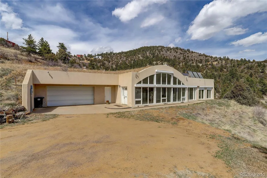 This Monolithic Dome (https://monolithicdome.com/) home is sure to please those searching for the perfect eco-friendly mountain house. Built into the earth, this home is able to take advantage of geothermal energy, reducing your need to use additional resources to heat and cool the house. The combination of passive solar and the solar water system used to heat up the floors is designed to keep the house nice and warm during the winter months. The wood-burning stove will also add additional heat when needed. Once you walk in you are greeted by a bright cheerful space with a wall of windows. The light from this front room spills into the rest of the open floor plan. The kitchen, dining room, and family room are all open with a massive skylight bringing the daylight in. Solar tubes are scattered throughout the home bringing in natural light throughout the day, practically eliminating the need for electric lights during the day. Right off the family room is an office with a closet for extra storage. Down the hall from the family room and dining area are a full bathroom, a bedroom, and the massive primary bedroom with a 5 piece, ensuite bath. The secondary bedroom has high ceilings featuring a separate sitting area with ample sunlight and a sliding glass door to the patio. The primary bedroom has a bright sitting room with french doors that open to a little patio. In what is called the North wing of the home, you will find another large room with a 3/4 bath. The storage space adjacent to this room could be used as a closet. This north wing also has a separate entrance and access to a patio space. All windows have mechanized metal shutters, these provide not only protection from the elements but can also be used to keep the temperature of the home as steady as possible. With a few more modifications this home could be off-grid in no time. This property borders Centennial Cone Park so your view should remain the same for many years to come.