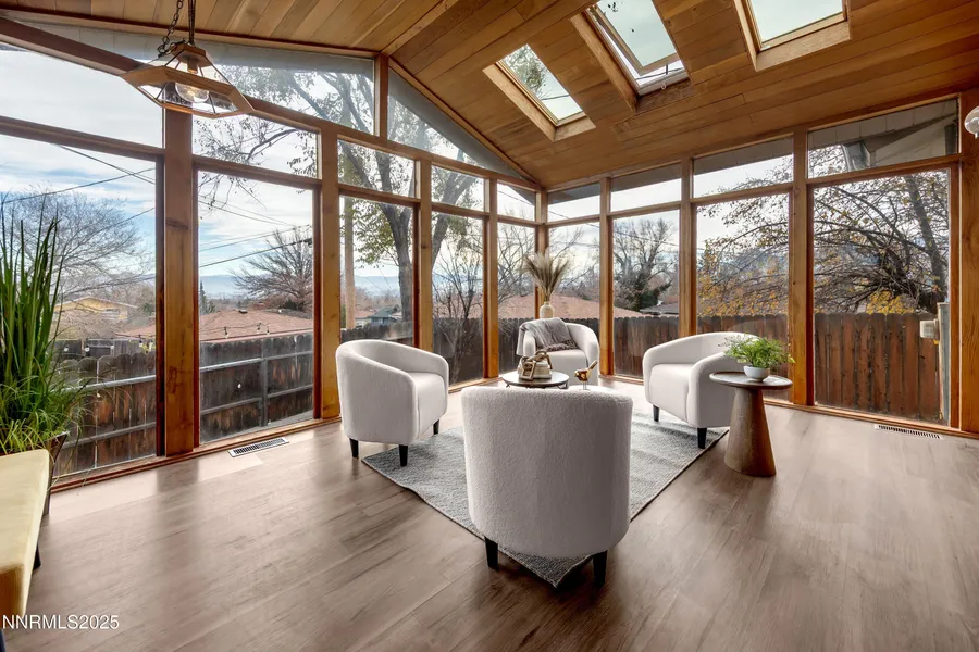Open House Friday 12/19 3-5pm and Saturday 12/20 10am-12pm. With VIEWS of the twinkling city lights, mountains in the distance, and your very own Sundance-inspired, glass and wood-enclosed "snow globe" room, this Old NW Reno home is the definition of cozy. And when the weather turns chilly, the real wood-burning fireplace becomes the heart of the home. (150 sq ft Sunroom is permitted and is in addition to the 1,210sf). All brand-new Samsung fingerprint-resistant stainless appliances give the kitchen a modern update. Just one block from Rancho San Rafael Park (area's best dog park and site of Annual Balloon Races) and minutes to UNR, it sits in one of Reno's most beloved and walkable pockets. Step inside to a blend of character and comfort: original oak floors grace most of the home, with LVP in the kitchen and dining room (no carpet). The interior has been freshly painted, lighting updated, and ceiling fans added to each bedroom. Natural light pours in through multiple sun tubes, and even the four-legged family members get star treatment with built-in doggie doors. Practical perks continue with the roof and furnace replaced in 2009, plus a fully fenced RV parking pad for toys, trailers, or extra parking. Water heater replaced in 2021. Shed in side driveway, all appliances and washer/dryer included. No HOA, so could make a great rental or Airbnb. With quick access to N. McCarran, freeways, trails, shopping, and dining, this home blends convenience with charm in all the right ways.