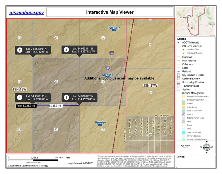 640 contiguous acres measuring 1 mile by 1 mile! Sits on its own aquifer! Prime Location for Industrial or Commercial Development. Seize this rare opportunity to own 640 acres of strategically located land in Mohave County, Arizona. Conveniently situated along Interstate 40 between Kingman and Yucca, near Exit 28, this property offers exceptional potential for industrial, commercial, residential, agricultural, or renewable energy development. The land is in a federally designated Opportunity Zone, making it an ideal choice for forward-thinking investors and businesses seeking significant tax advantages. Positioned within a 350-mile radius of over 30 million people, this property offers excellent regional accessibility for distribution, manufacturing, and logistics. It is also near the future Interstate 11 corridor, which will connect Phoenix to Las Vegas, and Mexico to Canada ensuring long-term growth and enhanced connectivity. With versatile potential, this land is well-suited for industrial, commercial, agricultural, or green energy projects. A deep aquifer, estimated to be less than 600 feet below the surface, supports sustainable operations, and electric and cable services are nearby, with convenient access to rail lines and major transportation hubs. As the fifth largest county in the United States, Mohave County provides vast opportunities for development and maintains a business-friendly environment. With prime visibility on Interstate 40 and proximity to Kingman Airport, this land is particularly advantageous for logistics hubs, distribution centers, and manufacturing facilities. This location is also ideal for mixed-use developments and can be easily subdivided to accommodate residential, commercial, or multi-purpose projects. At an elevation of 2000 feet the climate is ideal for year-round projects. The seller is knowledgeable and open to working with 1031 exchange buyers, making this an excellent option for those seeking tax-deferred investment opportunities. Don t miss this chance to secure a high-value property in one of the Southwest s fastest-growing and most accessible regions. Priced competitively, this exceptional land offering is sure to meet your development needs. An additional 500 acres may be available for purchase. See portion outlined in gray. Lot dimensions are estimates only. No owner carry, motivated seller. Seller is offering 5% buyer compensation. Seller is doing a 1031X.