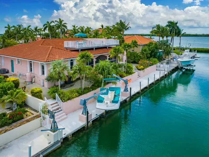 One lot in from Open Water in Cudjoe Gardens! Over 2,100 sq. ft. of living space in this ground level, above flood, concrete canal home loaded with Spanish-Mediterranean charm and a Rooftop Deck! Spacious Great Room with soaring 15 ft. ceilings. Well-designed kitchen with Spanish tile accents. Split floorplan offering 3 Bedrooms and 2 Baths. Sliders from the Great Room and Master Retreat open onto a screened-in Lanai overlooking the canal. Tile flooring throughout. Rounded archways and walls, Pine doors, tile accents, unique fixtures, and alcoves are just a few of the well-appointed details found throughout this unique home. Outside you'll find lush tropical landscape and a 100 ft. concrete dock with davits. The rooftop deck is a must see! The perfect venue for watching sunsets over the open water. The 10' x 50' rooftop deck is constructed of Brazilian Hardwood with a 15' x 20' tiled area plumbed for a hot tub. 2-car garage and paver driveway. 100 gallon cistern, perfect for landscape and car/boat wash usage. Located in the premier waterfront community of Cudjoe Gardens, a community of ground level custom concrete homes that are above the flood plain (no steps to climb!) which is a rare find in the Florida Keys! It is also one of the few neighborhoods that has a full-service marina offering fuel, bait, and refreshments with quick and easy ocean access.