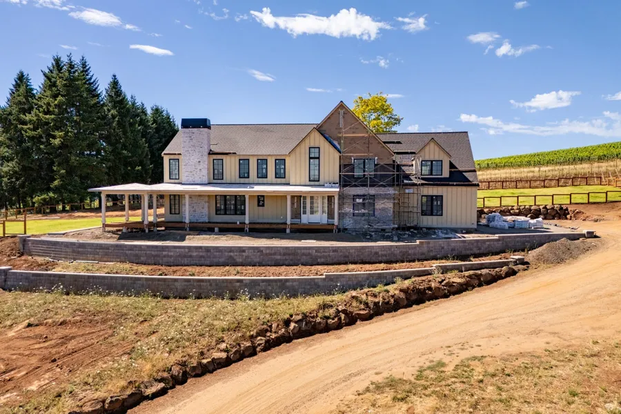 Experience the pinnacle of Oregon wine country living at this extraordinary vineyard estate, ideally located in the prestigious Dundee Hills AVA, one of the most celebrated wine regions in the Willamette Valley. Perched atop 15 breathtaking acres with 360-degree views, this newly renovated & constructed estate features 7 acres of newly planted Pinot Noir and Sauvignon Blanc vines, surrounded by refined, professionally designed landscape. Constructed by award-winning Street of Dreams builder, Elite Development Northwest this 6,599 sqft residence blends timeless elegance with modern luxury. From the moment you enter through the grand foyer, you're welcomed by floor-to-ceiling windows that perfectly frame the surrounding vineyard views. Every detail has been thoughtfully curated, including custom wood beams, custom cabinetry and built-ins, custom stone fireplaces, & high-end lighting throughout. The gourmet kitchen features rich wood tones, timeless quartz countertops, a spacious walk-in pantry, and a show-stopping custom glass wine cellar. The floor plan includes a luxurious primary suite with vaulted ceilings, a stone fireplace, vineyard views, and a spa-inspired bath with premium finishes. A secondary en-suite on the main level, a generous loft, and a large bonus room offer comfort and flexibility, while the expansive basement provides excellent space for additional storage, a secondary wine cellar, or root cellar. Step outside through beautiful Anderson doors to a generous deck and paver patio area, complete with an established olive tree, stone fireplace, & panoramic vineyard views, perfect for entertaining or quiet evenings. The fully fenced estate also includes a designated garden area, a fenced pet run, and a custom-built dog wash for convenience. Conveniently located just minutes from boutique shopping, award-winning restaurants, & world-class wineries, this exceptional property offers a rare blend of luxury, privacy & prime location. Sept 2025 Completion.