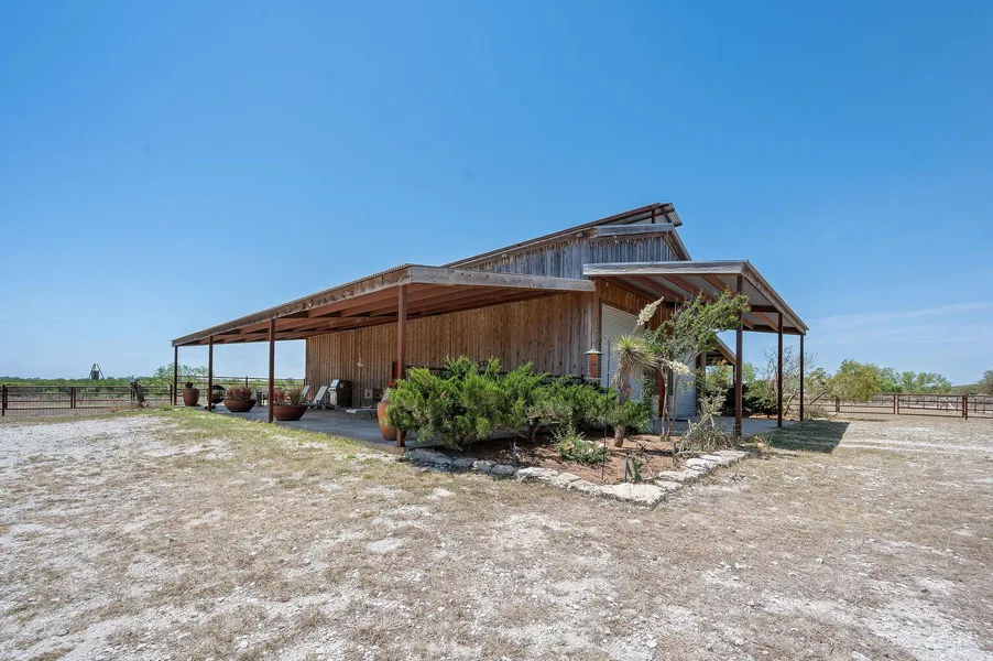 15.19 acres north of Evant, TX on CR 519 in Hamilton County. The property has a nice rock entrance with electric gate, that leads up to a barndominium with cedar siding that has a 60 ft. x 20 ft. covered porch on the northside and a stall shed on the south side of the barndominium for livestock. The barndomimium has 2 rollup garage doors and 2 walk-though doors. The living quarter in the barndomimium is 2 story with the bottom floor having 1 bedroom, closet with laundry room and office-study that could also be used a bedroom, the 2nd floor has an open floor plan with living room & kitchen with island, 1 bathroom and 1 bedroom. The property has a water well that is approx. 400 ft deep with 5000 gal. storage tank, a chicken coop and storage shed that matches the barndominium and garden area with the frame for a green house. The property has good fencing and is divided into three pastures.