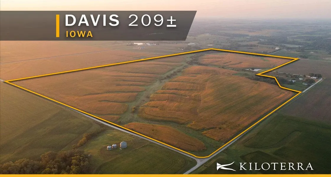 This 208.59 m/l acre farm is located just Southeast of Bloomfield, Iowa in Davis County. The property is predominately row crop and has been in a corn-bean rotation for several years. The farm is gently rolling, with most of the crop acres in the two large fields, which are split by a primary waterway. Terraces have been installed on the NE corner of the farm, and there are several waterways which have recently been widened and seeded down.