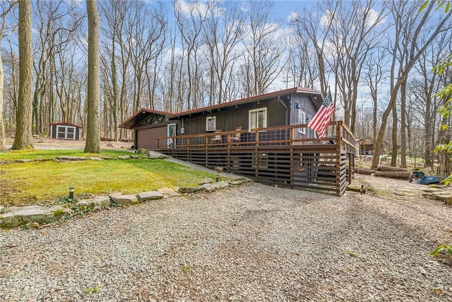 Beautifully renovated mountain chalet nestled on 3 wooded lots totaling 1.28 acres, offering a perfect blend of rustic charm and modern updates. This spacious retreat features vaulted ceilings, an open floor plan, and gleaming hardwood floors throughout. The fully equipped galley kitchen includes stainless appliances and a granite counter, ideal for cooking and entertaining. Enjoy the warmth of a fireplace in both the living room and family rooms, along with the convenience of a dedicated home office space and exercise room. Recently updated baths add to the home s appeal. Step outside to a wrap-around deck that overlooks a private yard and cozy firepit perfect for relaxing or gathering with friends. A 2-car attached garage completes this mountain getaway.