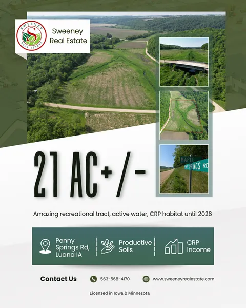 Scenic 21+ acre recreational property featuring the confluence of two streams right on site! This tract currently generates CRP income through 2026, with the option to renew. With pheasant numbers on the rise, this offers excellent habitat potential or perfect for adding food plots. Located less than a mile from the Yellow River, this is a prime spot for outdoor enthusiasts.