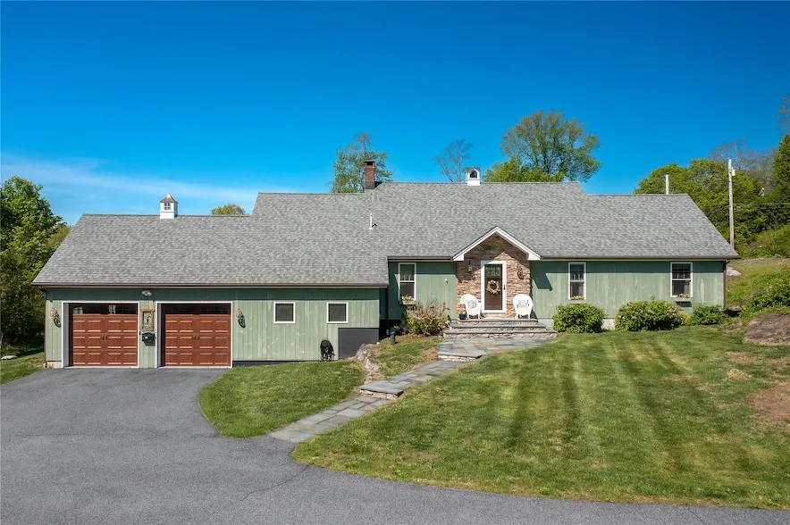 Nestled along a meandering drive, this stunning Modern Rambling Ranch welcomes you with charm and elegance. This unique home is built around the original fireplace of a 1929 one-room schoolhouse, preserving a piece of history at its heart. As you approach the front walkway and step through the front door, you're greeted by an expansive open-concept living space featuring soaring ceilings and a dramatic wall of windows and glass doors, seamlessly connecting the interior to the backyard and bathing the home in natural light. The kitchen is a true centerpiece wide open and beautifully appointed with a large center island offering seating, a built-in sink, and a dishwasher. Granite countertops, stainless steel appliances including a propane cooktop, and gleaming hardwood floors complete this stylish and functional space. Flowing effortlessly into the sun-drenched living area, you'll find a spacious layout perfect for BBQing and entertaining. Step through the glass doors onto a large stone patio ideal for enjoying breathtaking sunset views. The living room also boasts a grand stone fireplace and a convenient powder room with laundry. Off the kitchen are two bright and inviting bedrooms with hardwood floors. One features cathedral ceilings and direct access to the back patio through glass doors. A full bathroom with a soaking tub serves this wing of the home. The Primary Suite, located off the living room, is a serene retreat with large windows, hardwood floors, double closets, and a luxurious en-suite featuring a walk-in shower. Down the stairs , an unfinished storage area with a walkout offers additional storage and the oversized two-car garage includes high ceilings with pull-down stair access to additional attic storage. This exceptional home is equipped with a whole-house generator, forced hot air, and central air conditioning. Ideally situated just off Route 22, it's minutes from shopping, schools, I-684, I-84, and the Rail Trail offering both tranquility and convenience. A perfect blend of comfort, style, and accessibility, this home is ready to impress.