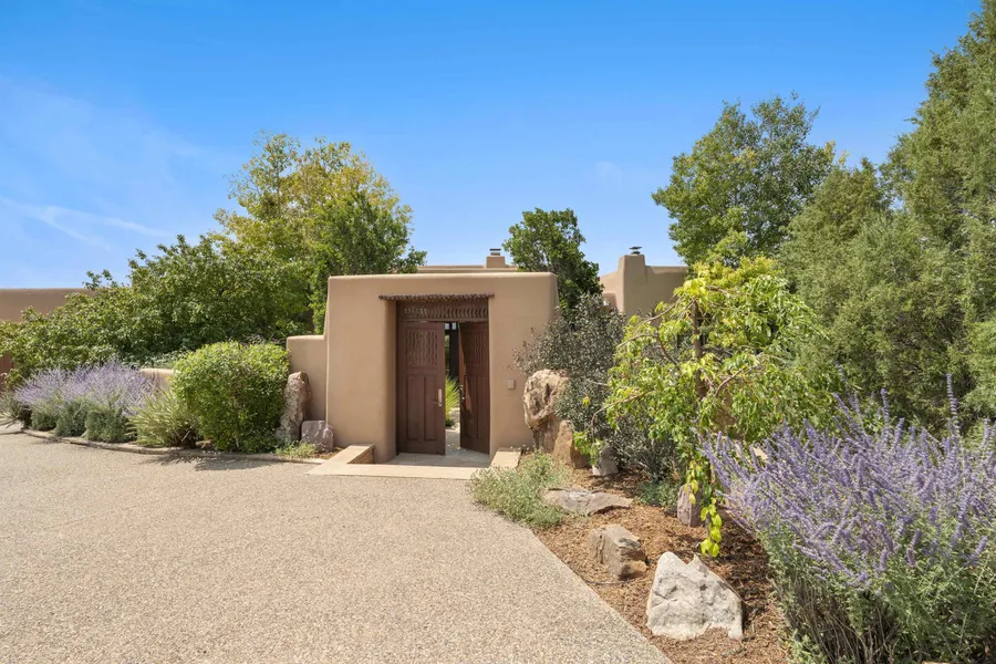 Rich in the quality that has come to distinguish Woods Builders homes, this Las Campanas home is a masterpiece of design and construction. The open architectural plan, consisting of four bedroom suites, an office, grand chefs kitchen, and multiple living areas, is rendered with exceptional style and executed with superior finishes. Gallery scale walls, inset lighting, and shelves embedded into diamond plaster walls establish elegant, integrated display areas. Soaring ceilings with massive spruce vigas, wood and flagstone floors, hand-carved wooden doors, and Southwest elements of columns, corbels, and kiva fireplaces are consistently applied. The inviting living room is accented by a grand, wrap-around shepherds fireplace and picture windows that face the portal. A spacious gourmet kitchen features a deep windowed breakfast nook, a black marble kitchen island, walk-in pantry, wine cooler, warming drawer, and two dishwashers to ensure seamless entertaining. Three suites, each with its own walk-in closet and private bathroom, are stylish accommodations in the separate guest wing. Behind carved doors is the Primary Suite, with a large-scale walk-in closet, fireplace, and elegant bathroom with jetted tub and separate shower. Sited on 1.9 acres against a backdrop of the Jemez Mountains, massive picture windows, glass French doors, and an expansive portal look upon vast sunset views and provide the stage for perfect outdoor entertainment and dining.
