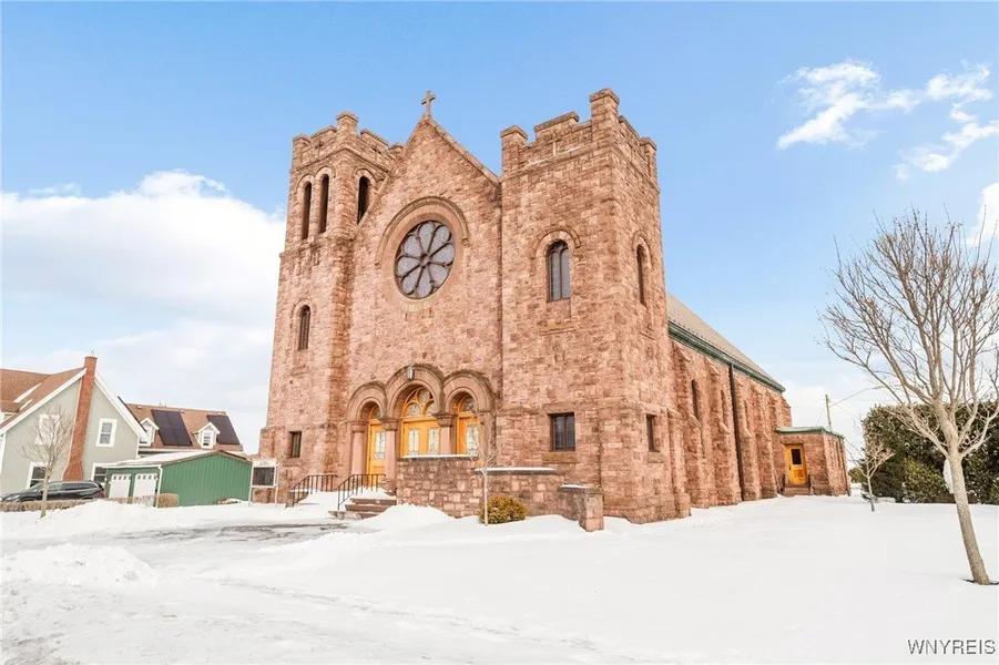 Located right in the center of the Village of Middleport, formally St. Stephen's Roman Catholic Church is a true centerpiece of the community. Its central location makes it a welcoming space for everyone, whether you're looking for a place of worship, reflection, or a setting for life's special moments. This church offers 42 expansive pews, creating a warm and intimate environment for both small services and larger gatherings. The peaceful atmosphere, with natural light pouring in, highlighted by one-of-a-kind stained glass and vaulted ceilings makes it the perfect place to find comfort and connection. In addition to the sanctuary, the church has a dedicated office providing the space needed for day-to-day operations and administrative tasks that help keep the church running smoothly. Cthoir balcony with pipe organ overlooking this magnificent space. Common and Private half bathrooms. Whether it's a Sunday service, a community event, or a quiet moment of prayer, this church offers a place for all to feel welcome. A large surfaced parking lot with covered pavilion offers the perfect outdoor meeting space. Being broken off of adjacent rectory, listed as Single Family Residence, see MLS#B1587622.