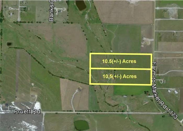 Approximately 21 acres subdivided into two 10.5 acre lots. Located just south of FM 455 and north of Pruett Road on west side of FM 1173. Fenced for cattle, some trees, a pond, and entrance on FM 1173. Buyer to verify all info.