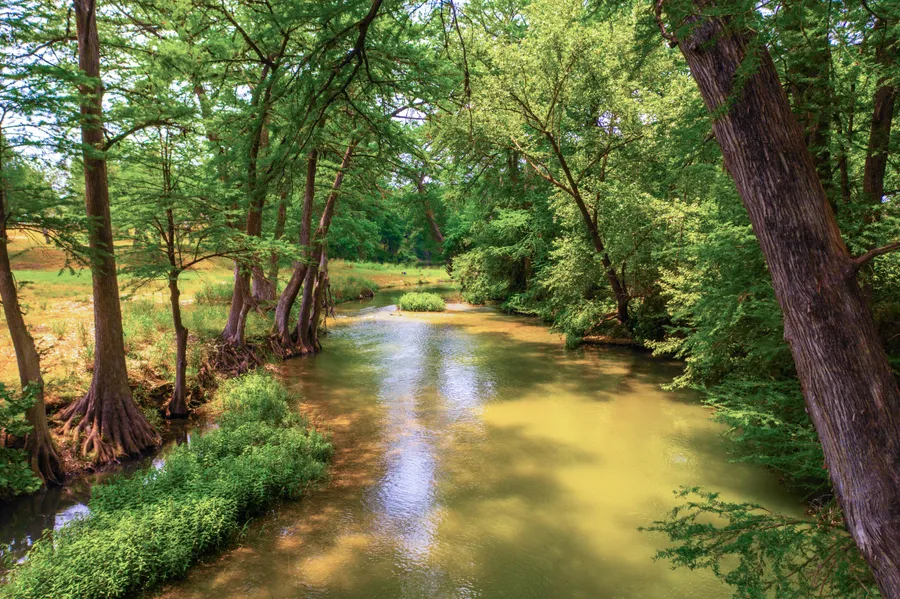 Guadalupe Springs Ranch is a testament to the natural beauty and diversity of the Texas Hill Country. The property features a varied topography with expansive hardwood forests, cultivated pastures, and fertile soil ideal for agricultural pursuits. Towering cypress trees along the river create a tranquil canopy, while stately pecan and oak trees add to the picturesque setting. The land descends over 40 feet, offering breathtaking views of the Guadalupe River and a park-like atmosphere with a verdant pecan orchard.