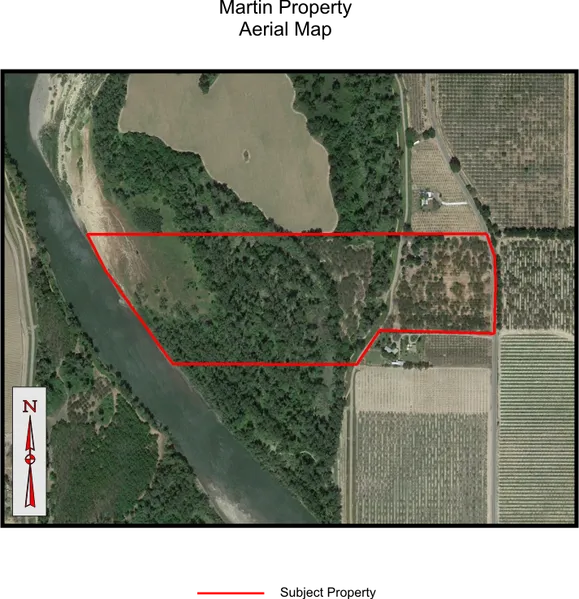 The surrounding land uses include a walnut orchard to the east, native land owned by The Nature Conservancy to the north, and both riparian land and an orchard located to the south. The elevation of the property is approximately 75 feet in elevation.