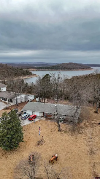This spacious 2,100+ sq. ft. home sits on a level 0.76-acre (m/l) lot bordering Corps of Engineers land, offering seasonal views of Bull Shoals Lake. Perfectly located just minutes from both river and lake access, this property provides the ideal blend of comfort, convenience, and natural beauty. Step inside to discover real hardwood floors, cathedral ceilings with exposed wooden beams, and a brick fireplace featuring both a wood insert and a pellet stove for cozy evenings. The open floor plan flows into a sunroom/spa porch that leads to the back deck, perfect for relaxing or entertaining. The split-bedroom layout adds flexibility, currently arranged to include mother-in-law quarters with a large private room and an updated bathroom. Additional features include a pantry, a 26' x 10' deck, and an oversized 32' x 36' attached garage—providing plenty of storage and workspace. Recent updates and practical upgrades make this home truly move-in ready: 200-amp whole-house generator, updated plumbing and electrical systems, new windows (2008), & new roof (2017). Enjoy peaceful lake-area living with modern comforts and rustic charm—all in one beautiful package!