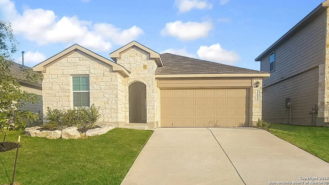 The Easton plan located at beautiful Brookstone Creek in San Antonio, TX offers a perfect balance of style, comfort, and functionality within a spacious 1680 square foot, single-story layout. Featuring 4 bedrooms and two full bathrooms, this home is designed with you and your loved ones in mind. A welcoming elongated foyer guides you into the heart of the home, where an open-concept kitchen, dining area and living room create a bright, airy space ideal for gatherings and everyday life. The kitchen stands out with stainless steel appliances, a gas cooking range, quartz countertops, a spacious kitchen island and a farmhouse style sink. Stylish flat panel cabinetry and classic white subway tile backsplash complete the modern look in this home. The primary bedroom suite, privately located at the rear of the home, offers a relaxing retreat with a walk-in shower, dual vanity sinks and a massive walk-in closet. At the front of the home, the secondary bedrooms provide privacy and flexibility - perfect for children, guests or home offices. Each features quality carpet flooring, large windows and ample closet space for comfort and convenience. This home includes our HOME IS CONNECTED base package. Using one central hub that talks to all the devices in your home, you can control the lights, thermostat and locks, all from your cellular device. Additional highlights of The Easton include vinyl plan flooring throughout the main living areas, a covered patio (per plan), full yard landscaping with irrigation and a pre-plumbed water softener loop. The Easton brings practical elegance to life in Brookstone Creek! We're ready to welcome you home!