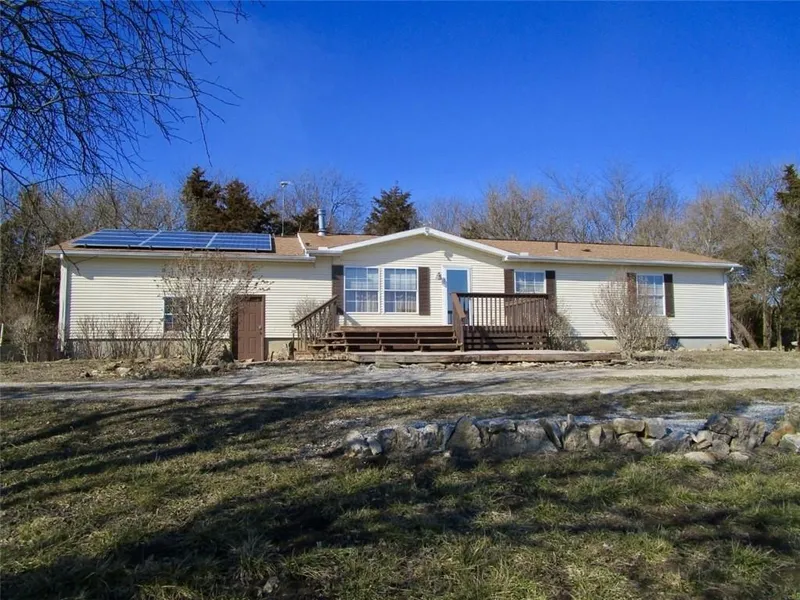 Horse Ranch on 30 acres with a very nice, well maintained manufactured home. Scenic overlook and plenty of timber, grazing, cross fenced, perfect for hunting and this property also features 2 ponds, 1 is spring fed for great fishing. This property is very self sufficient. Excellent set up for a Equestrian Farm with a 40x60 Morton Barn w/ 15' extensions for horse runs, 4 horse stalls(12x12) with Dutch doors to runs/feeders and a 10x14 enclosed tack room with door. This home is 3 bed 2 bath w/attached 2 car garage. Impressive fire pit area w/ lots of trees and rock gardens , also a she/he shed. Bonus solar panels w/backup batteries, still on the grid, selling generated power back to the electric co. & wood burning stove. Property is fenced and less than 1 hour S of Overland Park KS. Nice appliances remain with home. The heating and cooling system is only approx. a year and 1/2 old.