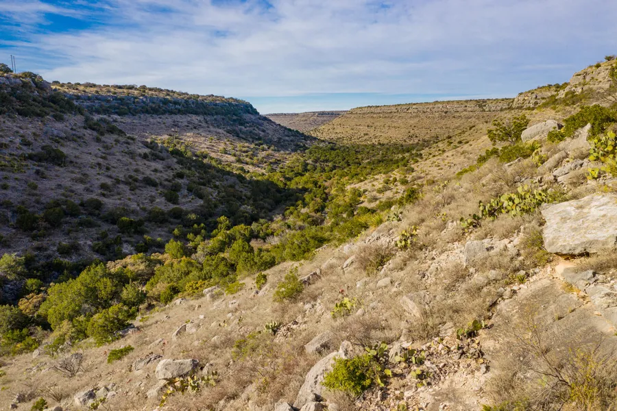 Slightly rolling terrain with thick native grasses, along with juniper scrub brush, cacti, and sotol. Terrain transitions into beautifully exposed limestone cliffs with unobstructed views that extend for miles. The bottom of these canyons offer a sanctuary for native wildlife and include oak and cedar vegetation. Elevation on the ranch ranges from 2,200 +/- asl to 2,509 +/- asl.
