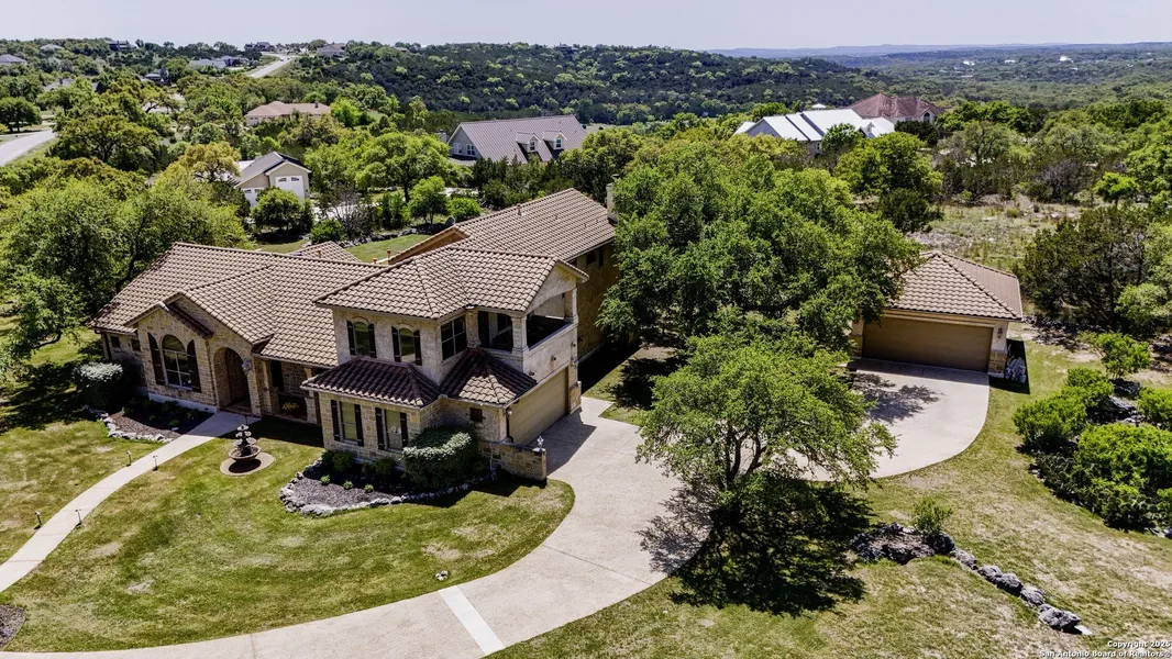 Exquisite "Texas Tuscan" Masterpiece in Mystic Shores at Canyon Lake Spring Branch, TX | 3,744 Sq Ft | 1.38 Acre Corner Lot | 4 Bed | 3 Bath | 4-Car Garage | Pool & Spa Step into Hill Country elegance with this stunning Mediterranean-style home, a former model built by renowned Travis Mitchell and Millennium Homes. Nestled on a sprawling 1.38-acre corner lot in the sought-after community of Mystic Shores, this luxury retreat is framed by majestic mature oak trees, offering privacy, breathtaking curb appeal, and timeless craftsmanship. Inside, you'll find 4 spacious bedrooms, 3 full baths, and thoughtfully designed living spaces with high-end finishes throughout. The main level features Travertine stone floors, a grand stone fireplace in the living room, and a gourmet kitchen with built-in gas stove and stone surround, large island, walk-in pantry, and premium appliances (all less than 5 years old). The primary suite is a serene escape, complete with a walk-in closet, jetted whirlpool tub, triple walk-through shower, and double vanities. A secondary main-level room with a custom stone accent wall and en suite bath offers flexible space as a guest room or office. A dramatic glass wall at the entry draws your eye to the outdoor oasis-heated pool with spa, covered patio with tongue-and-groove ceiling and full outdoor kitchen, plus a sunset-facing pergola perfect for evening relaxation. Upstairs, a loft with built-in cabinetry opens to a large game/media room with balcony where you can relax and watch the sunset. Two additional spacious bedrooms share a Jack-and-Jill bath with separate vanities. Additional highlights include: Oversized 2-car attached garage + 2-car detached garage Massive circular aggregate concrete driveway Custom iron stair railing Large laundry room with sink and built-ins Recent HVAC systems (under 3 years old) and water heater (under 2 years) Sprinkler system, alarm system, and landscape lighting. Located in the amenity-rich community of Mystic Shores at Canyon Lake, enjoy access to 2 pools, lakeside parks, tennis, pickleball, volleyball, and basketball courts, a nature preserve with hiking trails, a clubhouse with gym and rental spaces, and a nearby boat ramp for all your lake adventures. This is Hill Country living at its finest-luxury, comfort, and natural beauty all in one. ***1.59 acre lot adjacent is also for sale!!