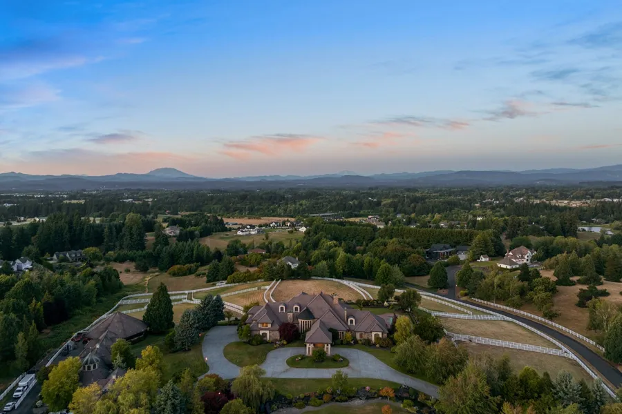 Enter the gates of this breathtaking Rolling Hills estate and discover a world of natural beauty and refined luxury. A private creek, koi ponds, and cascading waterfalls lead to a custom 12,533 square foot home set on 10 pristine acres. The grand 19-foot foyer opens into a soaring great room anchored by one of eight fireplaces. The office showcases impeccable craftsmanship with nail-less joinery and a stately hearth. Enjoy 6,819 square feet of main-level living, including a luxurious primary suite. The chef's kitchen features a Sub-Zero refrigerator, Dacor 6-burner gas cooktop, double ovens, two dishwashers, a warming drawer, and two butler pantries. The formal dining room is an architectural showpiece, perfect for entertaining. Take the elevator or sweeping staircase to three spacious ensuite bedrooms and a private guest quarters with separate entrance, living room, laundry, and large walk-in closet'ideal for guests or multi-generational living. The lower level is built for leisure with a bar, pool table area, fireside lounge, fitness space, steam shower, and hot tub. Outdoors, a pool and fireside patio offer the ultimate retreat. A 2,000-square-foot fully sustainable guest house provides stylish independence, while the carriage house adds rustic charm with a stone fireplace. Premier equestrian amenities include a 10-stall barn, tack room, wash rack, equipment room, and an 80-foot round pen with four-horse walker. Breathtaking panoramic views of Mount Hood, Mount St. Helens, Mount Adams, and Mount Rainier elevate this estate into a class of its own. A rare Northwest legacy property where natural beauty meets timeless luxury.