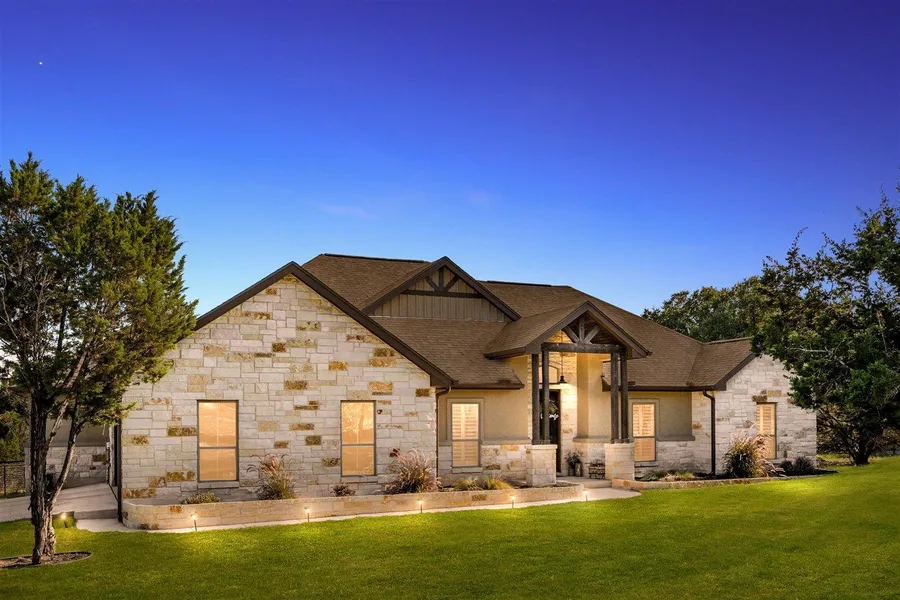 Enjoy over an acre of privacy with hill country views. The well appointed kitchen has custom white soft close cabinets, granite countertops, dual walk in pantry closets, a farmhouse sink, gas cooktop, built in double ovens, custom pot filler, stainless steel appliances, and is open to the living and dining room. Natural light throughout the living area flows into the dining room and living area--you'll love the vaulted ceiling with a beautiful beam. The real flame electric fireplace is perfect for ambiance or cool evenings. Pinterest perfect mudroom and utility room just off the garage and kitchen. A half bath is well placed here as well for guests. Spacious master bedroom with attached full bathroom--dual vanities, separate shower and tub, and a Texas-sized closet with built in storage. 3 bedrooms (1 used as an office now) with a hall bathroom on the other side of the home. The hall bathroom has a tub/shower combo and unique trough sink that is just the right custom touch!