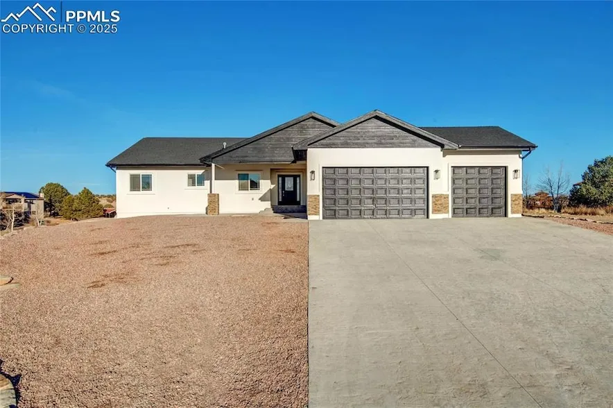 Stunning Ranch-Style Home on a Corner Lot in Pueblo WestThis beautifully designed 5-bedroom, 3-bathroom ranch home with a walkout basement sits on over an acre in sought-after Pueblo West. The prime corner lot features modern curb appeal, an extended driveway, and a spacious 3-car garage. Inside, natural light fills the open-concept layout with vaulted ceilings. The chef s kitchen boasts brand-new appliances, sleek cabinetry, and granite countertops. Step onto one of two decks off the kitchen and living room to enjoy the Colorado scenery. The main level includes three bedrooms, including a luxurious primary suite with a spa-like 5-piece ensuite. A spacious mudroom/laundry area adds convenience. The finished walkout basement offers a large family room, wet bar, covered patio access, two additional bedrooms, and a full bath. Plus, enjoy year-round comfort with central A/C!