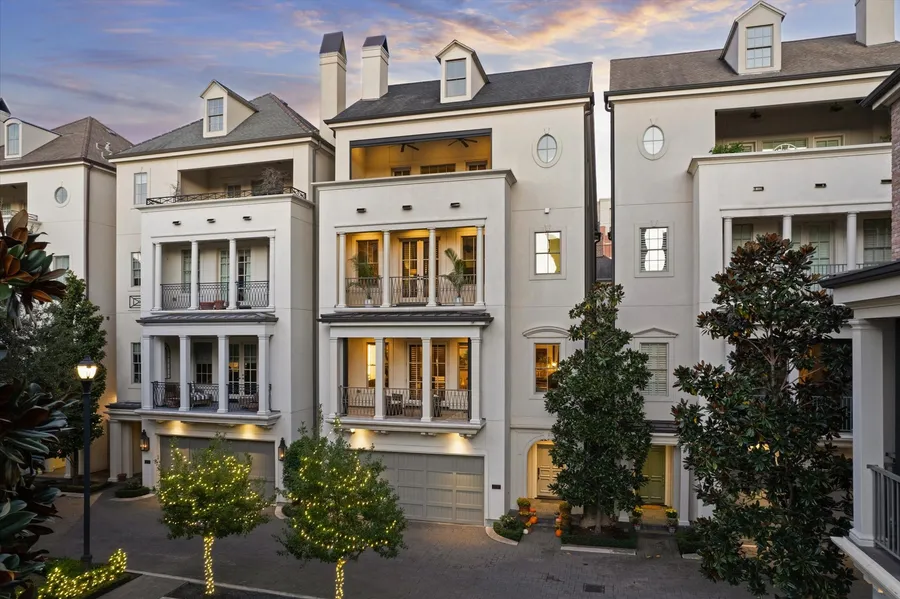 This beautiful patio home is located walking distance from the River Oaks Shopping District in a charming gated community with a central courtyard and generous guest parking. Built by Pelican, the home features rich millwork, multiple outdoor patios with retractable insect screens, a private backyard, a 3-car tandem garage, and an installed elevator to all floors. The ground floor entry provides access to a guest bedroom suite with patio access, and a stairwell to the upper floors. Second floor features an island kitchen with stainless steel appliance package and an adjacent grilling patio, and shared living areas with high ceilings and rich finishes. Third floor primary suite with two walk-in closets and spacious bathroom. Secondary bedroom has en-suite bath and closet. Fourth floor boasts large patio with Galleria skyline views, a wet bar, full bathroom, and large game room (potentially a fourth bedroom). Shows beautifully!