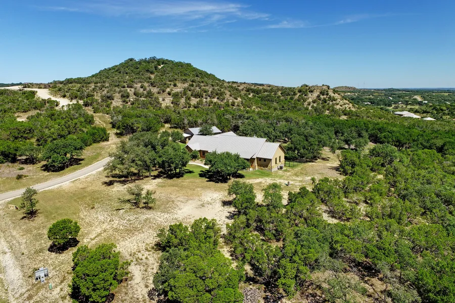 Elevated Hill Country Homestead comprised of a stately 3 bed, 3.5 bath residence and a 1200+/- sqft hobby enthusiasts dream workshop on 6.44+/- acres located just 45 minutes from Austin or San Antonio in a remarkable ranch community boasting free ranging exotic animals and 2 stocked fishing lakes. Enjoy mesmerizing views and a cool Hill Country breeze from the shaded porches of a quality crafted 2944+/- sf home built in 2017 featuring a stellar floorplan: open main living area, ensuite baths for every guest room, flexible study featuring a wall mounted bed to serve as a fourth bedroom when needed, spacious master suite, and expansive closets throughout. The efficient chefs kitchen is sure to please with Thermador appliances, farmhouse sink, and ample pantry closet. Oversized attached 2 car garage with workbench compliments the insulated, heated and cooled 1200 +/-sqft metal frame workshop showcasing (2) 10 x 10 insulated electric doors and additional work/storage space perfect for projects of all sizes. Both improvements have a lovely view of the established raised bed garden producing gorgeous vegetables, tomatoes, and herbs. Ideally equipped with both well water and a 30k gallon rain harvesting system for optimal water quality and allocation. This estate is designed to be extremely private and low maintenance while living like a much larger ranch with full access to an 80+ acre nature preserve, hiking trails, and 2 sparkling lakes. Experience daily safari like cruises or hike through the winding trails of this stunning ranch among the elk, lechwe, black buck, and oryx. Undoubtably one-of-a kind country living one must see to believe. 1-d-1 Ag exemption and underground utilities including high speed internet currently in place. No city tax and low HOA dues. Minutes to local shopping, dining, and wineries.