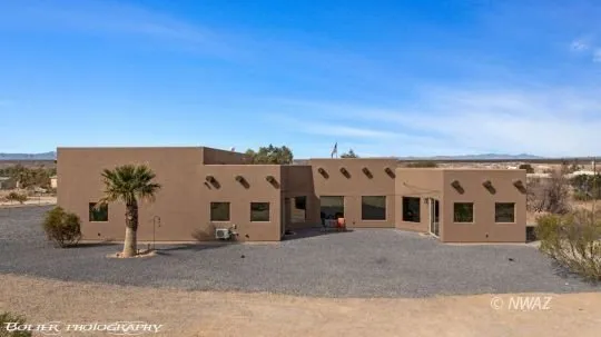Custom built 3375 sq foot home in Desert Springs, AZ. Located on 1.66 acres with beautiful mountain views. Looking for that perfect home with space from neighbors and plenty of room to park toys than you must have a closer look. Massive 1800 sq. ft. five car garage with 14' RV garage. Hand shaped logs over the front entrance and dramatic vaulted ceilings range in height from 9' to 14'. Gorgeous stained concrete floors compliments an open and liveable floorplan. The kitchen boasts double stoves and hoods, custom cabinetry, spacious pantry and center walk-around island. Adjoining dining area & great room perfectly fit each other. All primary windows direct you to the picturesque mountain and desert views with an abundance of natural light. The primary ensuite comes with an oversized beautifully tiled shower and spacious walk-in closet. Even includes your own theater room to be enjoyed from the comfort of your own home. A snack bar included in theater room is an added bonus. Outside enjoy a firepit, room for trailers and toys along with full RV hookups. Desert Springs just 20 min. to St. George and 10 min. to Mesquite NV. Mild winters and 300 plus days of sunshine.