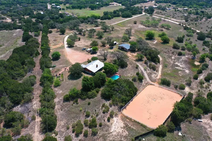 Tucked away on a dead-end road accessed off scenic FM 1715 sits this 15 acre property with incredible views. The semi-custom, single-story, 1750 square-foot home features granite countertops, French doors, and a cathedral ceiling. The property also includes a pool overlooking the riding arena with scenic Hill Country views.