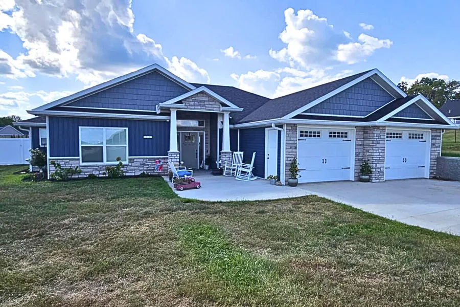 Craftsman's Charm Meets Modern Comfort. Stunning 3-bedroom, 2-bath slab ranch home located just outside the city limits in a desirable newer west end subdivision. With 1,897 sq ft of thoughtfully designed living space, this home offers a perfect blend of style, functionality, and privacy. Step inside to soaring 10-foot ceilings with tray detailing throughout, creating a spacious and airy atmosphere. The heart of the home is the gourmet kitchen featuring granite countertops, a center island with sink, custom solid stained wood cabinetry, and a large butler's pantry with a built-in coffee bar. Stainless steel appliances. Enjoy a split-bedroom design for added privacy, with the luxurious master suite boasting a walk-in shower, double sink vanities, and a walk-in closet that conveniently connects to the laundry room. Each bedroom includes large closets, offering ample storage. Outside, relax on the covered rear patio and take in breathtaking sunsets over your .46-acre lot, enclosed by a 6-foot vinyl privacy fence. Additional features include a 2-car attached garage, irrigation system, and a 12x24 detached work shed with electric and a mini splitperfect for hobbies or extra workspace. Located just minutes from Highway 50, this home offers peaceful living with quick access to city amenities.