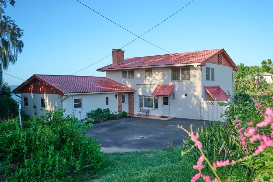 Crooked Lake Lakefront. This 2 story house has 6 bedrooms, 3 bathrooms, 3466 Sq Ft living area and is situated on 2.52 Acres with 127 feet of lakefront. Downstairs there is the kitchen with an eat in area, dinette, dining room/living room with a fireplace, glass enclosed porch, master bedroom suite, 2nd and 3rd bedrooms, 2nd bathroom, laundry closet, utility room/pantry and utility room with water tank and ac handler. There are some terrazzo floors downstairs. Upstairs there is an office, 3 bedrooms, full bathroom and another office with plumbing that could be an upstairs kitchen. The 600 sq ft garage/workshop has an over head door and built in work bench areas. The lakefront has a cleard sandy beach area.