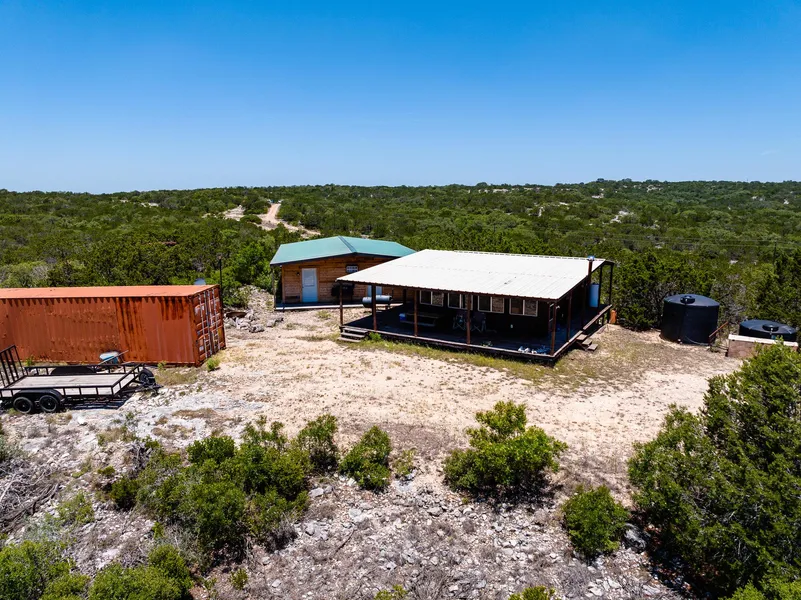 The campsite is situated on a high point, offering scenic hilltop views. The main house is 1,344 sq/ft with 1BR/1BA, an open floor plan, spacious kitchen and dining area, and a wood-burning stove. The house has wrap-around porches with large windows offering excellent views of the beautifully rugged, semi-arid landscape dominated by oaks, Ashe juniper and honey mesquite. Additionally, there is a 960 sq/ft bunkhouse with 2BR/1BA with a large walk-in closet and laundry facilities. Two covered storage containers provide extra living space, one with a walk-in cooler. The property is operational with electricity and a well distributed water system, benefiting from ranch community owned wells. There are also several large water storage tanks which pipe water to wildlife and livestock watering troughs.