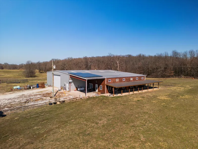Welcome to your retreat just minutes from Stockton Lake! This barndominium setting on 20 acres offers a spacious 1,680 sq ft of living space. The main level displays high ceilings, an open-concept kitchen, dining and living area. Enjoy the comfort of the large master suite, complete with dual vanities, large walk-in closet and access to the wrap around porch for relaxation. On the same level, you'll find an additional bath with utility room. Efficiency is key with solar panels, pellet stove, propane wall heaters and fiber internet. From the utility room step into the massive 80ft x 60ft shop. This shop provides concrete floors, 110 & 220V electric, several workbenches, additional bath, office space and ample storage for all your boats, RV, UTV's and MORE! This property is fenced for all your animal needs. There is additional space in the barn for your hay or equipment. Don't miss this opportunity to own a primary residence or vacation home just minutes from Stockton Lake!