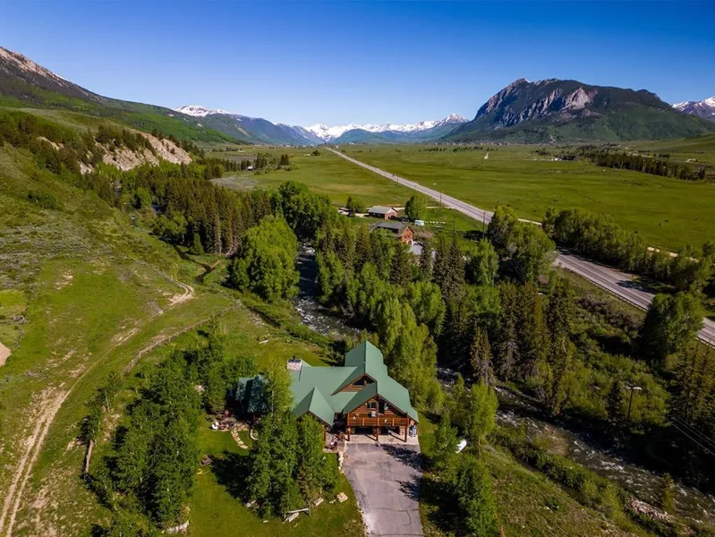 Prepare to be inspired by this remarkable mountain retreat. This 4-bedroom, 2.5-bathroom residence is conveniently located just minutes fromdowntown Crested Butte and a mere 10-minute drive to the resort. Nestled on approximately 9.25 acres above the Slate River, the property boasts mature landscaping and breathtaking views of the valley. This well maintained home features custom wormy maple cabinetry, reclaimed hardwood flooring, and natural stone countertops throughout. The gourmet kitchen is equipped with a Wolf range, slab countertops, and bespoke fixtures. The Great Room showcases impressive vaulted ceilings, hand-hewn logs, and panoramic views, centered around a stunning handcrafted stone fireplace. This space embodies the essence of Western charm, combining open layouts with natural materials for a warm and inviting atmosphere. The surrounding large yard, decks, and patios create an ideal setting for relaxation and entertaining. Additionally, the property includes a generous building area suitable for a guest house, offering elevated views. Equestrian enthusiasts will appreciate the custom-built barn, two partially enclosed loafing sheds, and fenced pasture. The pristine Slate River borders the property, teeming with native trout, and a natural spring is also present, complete with water rights for irrigation. Experiencing this property in person will leave you with that"aha" moment.