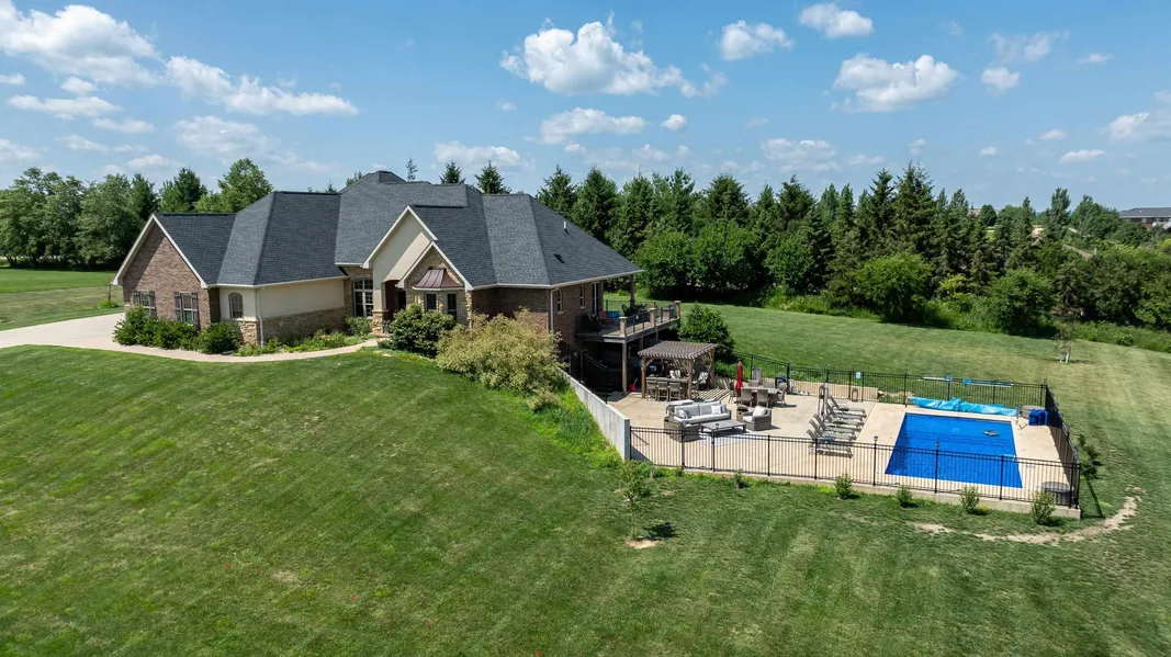 Your palace awaits! Feel like royalty as you step into the grand entry with marble floors and decadent finishes throughout. Retreat to the office with French doors and a large window, filling the room with the warmth of natural light. The kitchen is a culinary dream with top of the line appliances, granite counters, a must have hidden pantry and built in dinette over looking the pool. The covered deck invites you to enjoy the peaceful and private setting. Host a dinner party in the formal dining room with custom trey ceiling. Relax in the living room with impressive 18' ceilings and floor to ceiling fireplace. The primary suite is not only elegant but also offers a spa like bath, with tub, shower and heated floors. The upstairs has 2 more bedrooms along with a bonus room and office space. The lower level has a spacious living area and plenty of room for guests wanting to stay awhile longer. There is an additional staircase leading to the exterior, ideal for a home business. Warmer weather will have you spending your days lounging on the patio or swimming in the pool. This home is truly remarkable!
