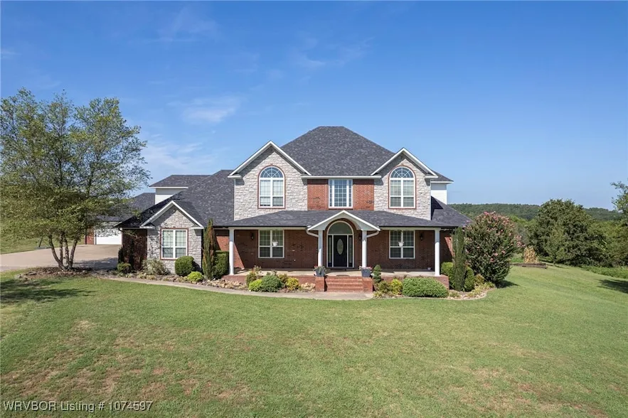 4.14 acres of picturesque land with breathtaking mountain views, this stunning 4-bedroom, 3.5-bath home is the epitome of luxury & comfort. Designed for those who love to entertain, the property boasts three spacious covered porches, one complete with a gas line, ensuring you can enjoy the stunning scenery. The home seamlessly blends indoor & outdoor living, featuring a half bath conveniently located near the pool area as well as a saferoom. The attached oversized 2-car garage offers attic storage, while the detached garage accommodates two full-sized vehicles & includes a third door for lawn mowers & utility vehicles. The kitchen is a chef's dream, featuring custom cabinets with pull-out drawers & hidden spice racks, complemented by an expansive open-plan layout that flows into the living room. Enjoy casual meals in the cozy eat-in kitchen area with a gas log fireplace. The living room's elevated ceilings create a spacious atmosphere. The enormous primary bedroom is complete with an en suite bathroom featuring a walk-in shower, soaking tub, & an electric wall fireplace. The attached dream closet includes a makeup vanity, custom shelves, an island wardrobe, & a built-in ironing board. Upstairs, you'll find three large bedrooms, two full baths, & a game room that could serve as a fifth bedroom. The home features brand new carpet in all bedrooms & the living room, with hardwood plank flooring and ceramic tile throughout the rest of the house. The saltwater pool, with a new liner installed in 2023 and a high-efficiency pump from 2022, With abundant storage space, upgraded lighting, fans, and fixtures, this home is as functional as it is beautiful.