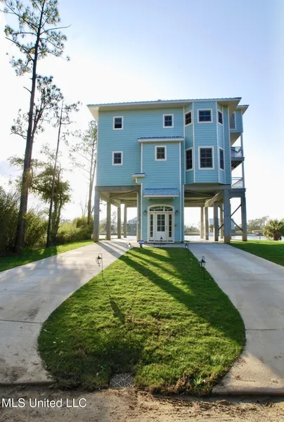 Breathtaking Views and over 100 feet on the water make this spacious 4 bedroom, 3.5 bath home a must see! The open concept living area is on the third floor, but never fear, there is an elevator that goes to all floors. The space includes a wet bar with ice maker & wine fridge and an efficient kitchen with stone counters & stainless steel appliances. The roomy primary bedroom has an en suite bath boasting a double vanity, jetted garden tub and separate shower. Other features of the home are crown molding, recessed lighting, ceiling fans, tankless water heater, security system and sound system. Only minutes to the Bay, Wolf River or Jourdan River, so you can hop on your boat for a day of fishing and water sports or cruise across the bay to enjoy the charming, bustling Old Town area of Bay St. Louis. Prefer to spend the day on shore, take advantage of the Timber Ridge amenities - community pool, tennis/basketball courts, and Treasure Point with pavilion area, playground & boat launch. Plus, the Pass Christian Isles Golf Club just happens to be in Timber Ridge. Home is being sold fully furnished including all appliances and electronics. Just bring your bags. Make this your Coastal retreat and spend your evenings relaxing with a drink on the porch and enjoying a gorgeous sunset.