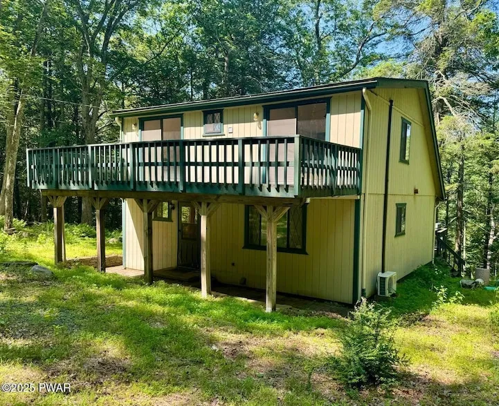 Surrounded by woods and the peaceful sounds of nature, this 1.5-story Creek front home offers quiet comfort and rustic charm on nearly two private acres in Pocono Mountain Lake Estates. Repairs have recently been completed, the list of repairs have been uploaded onto the listing. The 3-bedroom, 2-bath layout includes a vaulted main living area with exposed beams, skylights, and a cozy wood-burning fireplace. Large sliding doors open to a spacious back deck, perfect for enjoying the surrounding trees and fresh air. The flooring in kitchen has been updated and both bathrooms feature stylish tilework and modern fixtures. The primary bedroom is located on the main level, while two additional bedrooms upstairs each offer deck access and natural light. Additional features include upgraded panel flooring throughout and mini-split units cooling. Tom's Creek runs through the back of the property, offering a steady, calming ambiance of running water in the background. A circular driveway provides easy parking. Located just 10 minutes from Bushkill Falls and close to Delaware Water Gap and Shawnee, this home is ideal as a year-round residence or weekend getaway. Community amenities include a pool, tennis courts, clubhouse, beach access, road maintenance, and private security.