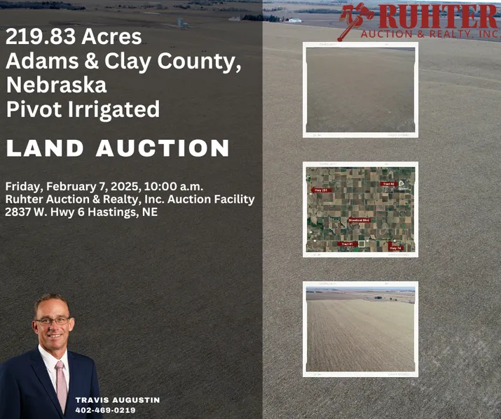 Seize the opportunity to own 219.83 acres of pivot irrigated farmland in Adams & Clay Counties, Nebraska. Perfect for expanding your farming operation or diversifying your investment portfolio. In an area with numerous competitive markets for the crops produced this is a tremendous opportunity!