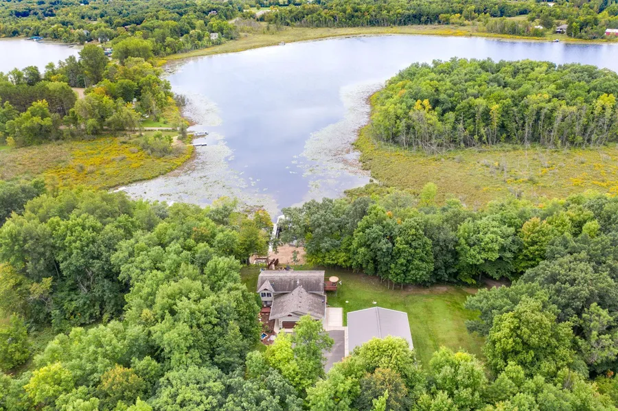 Magnificent lakefront acreage property! This private serene escape on over 4 acres is updated and move-in ready. Stunning kitchen is all completely new, featuring KitchenAid stainless appliances, granite, tile backsplash, ceramic tile floors, frosted glass cabinet doors and pantry doors. Expansive 55x34 outbuilding with a heated and insulated stall serves all your storage needs. The 3-car attached garage is fully finished, heated & features epoxy floors. 135 ft of lakeshore on Little Horseshoe Lake offers recreation and tranquility while offering the best of the lake lifestyle. Great fishing - crappies and a lot of turtles. Two decks overlooking long picturesque views of the water. Elegant neutral updates throughout; fireplace & bar room in the lower level perfect for entertaining. Stone firepit & surrounding patio area. Terrific wooded lot offers privacy from every side. Have your own private retreat while still having easy access to I-35. This property is a must see!
