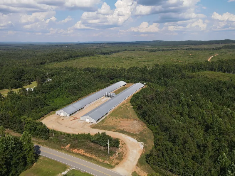 Mellow Valley Broiler Farm is a two-house poultry operation located near Cragford in Clay County, Alabama. The farm sits on approximately 22 acres and includes two 54x512 broiler houses that were constructed in 2018. These houses are equipped with top-of-the-line Chore-Time equipment and Chore-Tronics 3 controllers. The houses are connected by a breezeway and supported by a 125 kW generator to ensure continuous operation during power outages.