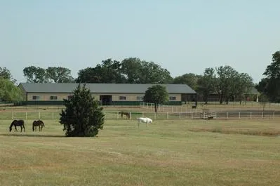 The first-class, 44 x 140 steel framed horse barn is insulated and plumbed for heat, has a sixteen foot center concrete aisle and thirteen 14x14 stalls with auto waterers, an office/lab, tack room, feed room and two wash racks. Outside the barn is a lighted outdoor riding arena, several fenced turn out lots and spacious cross-fenced coastal pastures plus a nice stock pond. All fences are pipe & cable or slick wire and the soil is a sandy loam.