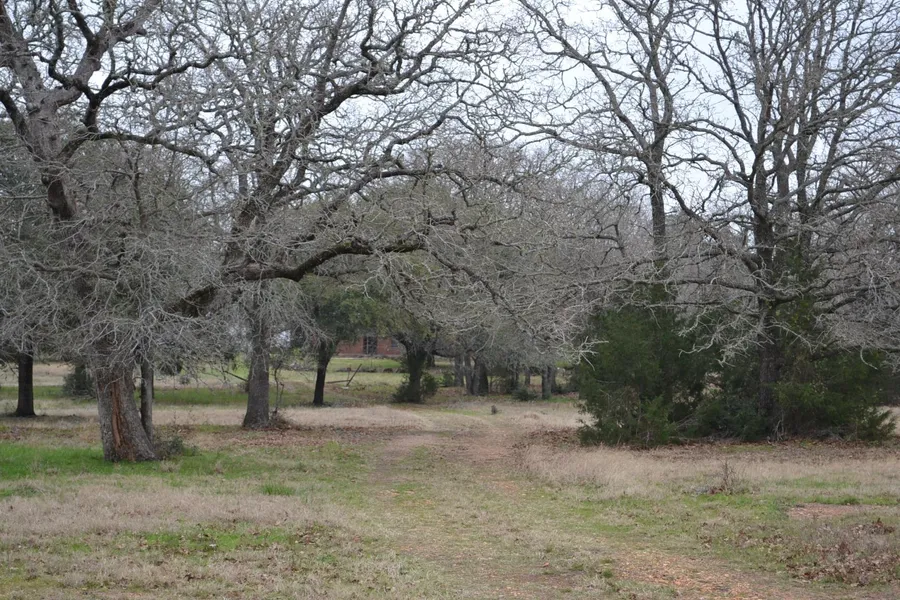 Terrain: Slight elevation change with gentle sloping and grassy knolls. Sandy loam soil with a mix of native Oak and Elm trees fill the open pastures with 2 stock tanks.