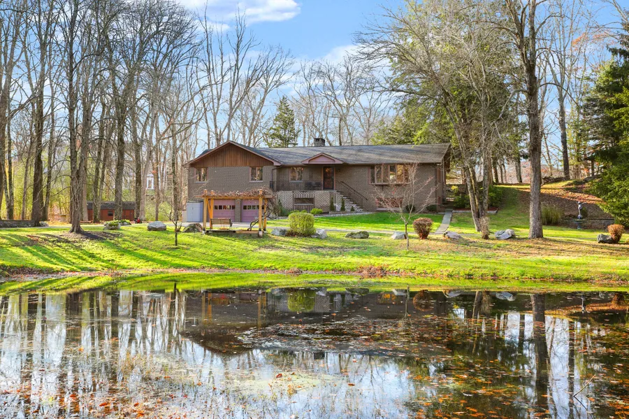 Drive through the stone pillars to your picturesque oasis nestled on over 3 acres of quiet mid-country Greenwich. First time on the market, this custom built ranch features 10 rooms, 3 bedrooms and 3 baths. Master bedroom with ensuite and walk in closet. The sunken living room with bay window opens to beautiful park-like views. Sparkling hardwood floors throughout. Custom paneled library/office, 2 fireplaces, cozy sunroom, large finished basement and oversized 2 car garage. The bucolic property is enhanced with a pond, streams and a covered outdoor living space with open fireplace. 45 minutes to NYC and 10 or so minutes to downtown Greenwich shops and restaurants. This is an excellent opportunity for immediate move-in or for an addition/renovation to make it your own dream house!