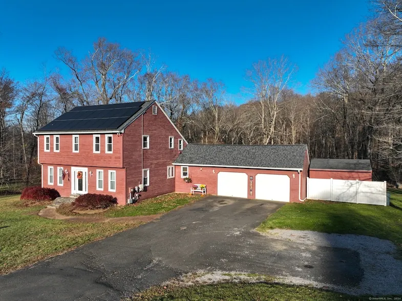 Located on a peaceful cul-de-sac, this charming Saltbox Colonial offers a spacious and functional floorplan with plenty of room to entertain and relax. Set on a generous 1-acre lot, this home features a formal living room and dining room, an eat-in kitchen, and a cozy family room complete with a gas log fireplace-perfect for gathering with family and friends. The main level also includes a convenient laundry area within the first-floor bath, adding to the home's functionality. Step outside to the large deck and expansive backyard, ideal for outdoor enjoyment and activities. Recent upgrades include 50-year asphalt shingles installed just 5 years ago, providing long-term durability and peace of mind. The home is also equipped with solar panels, offering significant savings on heating costs, especially during the colder months. Upstairs, you'll find generously sized bedrooms and another room that was used as a bedroom and a remodeled full bath that combines style and practicality. The full, unfinished walkout basement provides ample potential for expansion, with a large pantry and plenty of room to finish according to your needs. This level is heated by either a kerosene heater or a wood stove for versatile heating options. This well-maintained home offers both comfort and efficiency in a sought-after location. Schedule today and explore all the possibilities this property has!