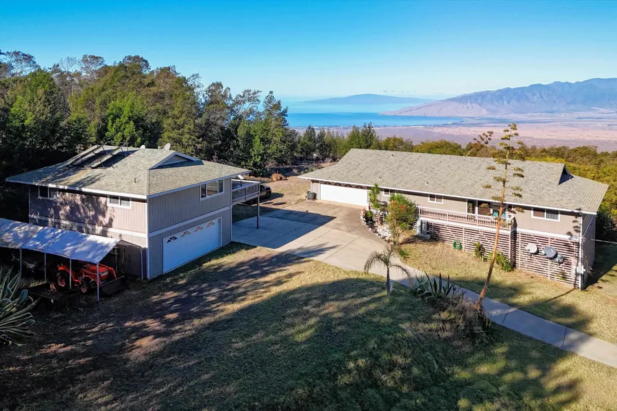 Set on 2.77 acres with sweeping ocean and mountain views, this Maui property combines natural beauty with convenience. Located in a sweet spot just minutes from Kula Elementary School, Morihawa Store, Kula Ace Hardware & Nursery, cafes, and other amenities, the property offers the perfect balance of rural tranquility and accessibility. The single-level main home features a wheelchair-accessible design, an open floor plan, a spacious kitchen with ample pantry storage, and a 759-square-foot garage. The detached two-story cottage includes two bedrooms, two bathrooms, and an expansive deck overlooking the serene surroundings. Its lower level offers an 884-square-foot garage with a half bath and flexible outdoor space for pets, a workshop, or recreation. At 3,100 feet elevation, the property enjoys a cool climate, abundant natural light, and open landscapes. The lower pastures offer plenty of room for additional agricultural or recreational use. There is a permitted extension of electrical and water stretches to the lower portion of the property. The survey was recently completed. Being sold As Is. Seller is downsizing and is motivated.