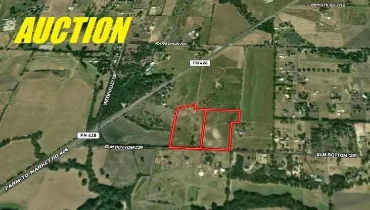 $10,000 PER ACRE WILL BE THE OPENING BID FOR THIS 22.37 ACRE PROPERTY DIVIDED IN 2 TRACTS BEING OFFERED FOR SELL IN A LIVE AUCTION ON FRIDAY, MARCH 5TH AT 12:00 NOON. Auction Registration begins at 10am. The 22,37 acre Property is divided in 2 Separate Tracts. Each Tract is 11+acres, Buy Either Tract or Buy Both. Located just East of the Intersection of Hwy 428 and Elm Bottom Circle. Prime Homesites or the perfect size to build your Dream Ranchette in the Heart of Horse Country. Enjoy your privacy with shopping, dining, recreation, and entertainment nearby. Just a few miles to Hwy 377 and I-35W with easy access to Denton, Sanger, Dallas, Fort Worth and DFW Airport. Sells AS IS. NO CONTINGENCIES related to Financing, Post Sale Inspections or Appraisals and NO OPTION PERIOD. 10% Buyer's Premium will be added to the High Bid to constitute the Total Contract Price. Buyer's Premium is paid the day of the Auction by Cash or a Personal or Business Check will be accepted when accompanied by a Bank Letter of Guarantee or other Proof of Funds. Remaining Balance is due on Thursday, April 16, 2026 by 5:00pm at Acrisure Title of Texas in Frisco, by Cash, Financing or a combination of both.