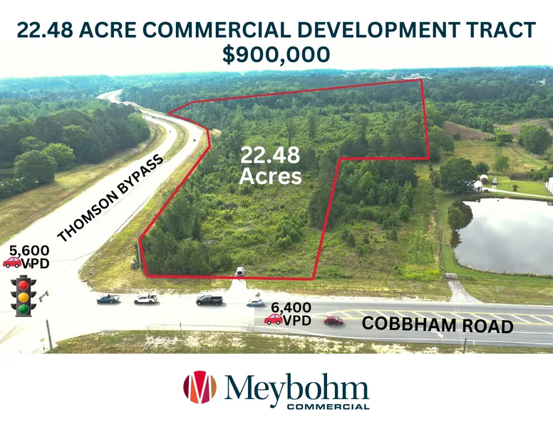 Located on an ideal hard corner, this development site offers an excellent opportunity in Thomson, Ga. This piece offers 22+/- acres of corner lot located at the intersection of Cobbham Road and the Thomson Bypass. This tract would be a perfect multifamily site or as a convenience store corner. McDuffie County Schools recently purchased the land across Sills Branch for a future school site as well. With new construction homes across the intersection, this piece could be used for a variety of different developments.