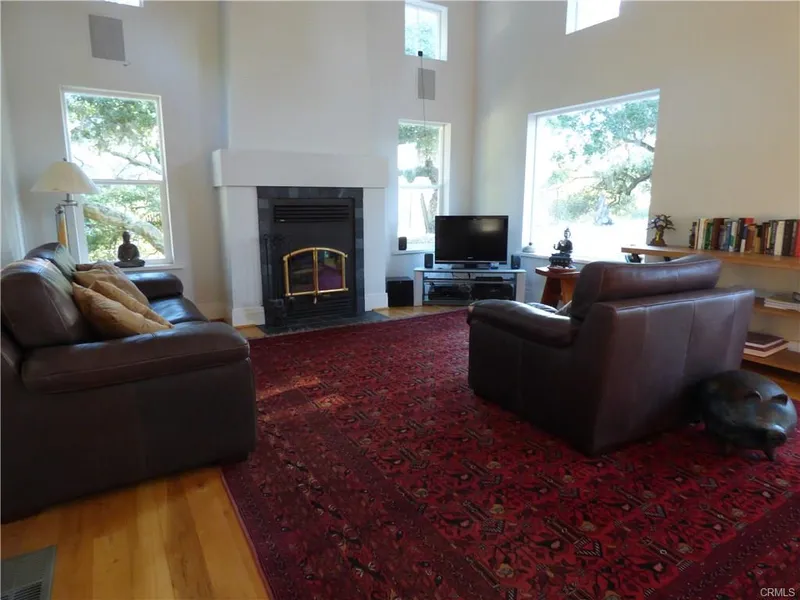 This fabulous single level home sits hilltop on just over 5 acres of beautiful oak studded property. This 2 bedroom 2 bath home offers a cozy open floor plan and you can enjoy views from every room in the house. The updated kitchen includes glazed tile counter tops, stainless appliances, custom cabinets, breakfast bar and opens up into a cozy dining area and living room with a wood burning fireplace. The living room leads out to a peaceful covered porch complete with outdoor fans for those warm summer nights. This home has high ceilings, clear story windows, hardwood floors, and is flooded with natural light. The detached oversized 2 car garage includes a laundry area with a utility sink as well as an office area with amazing canyon views. Country living, close to town, easy access, gated entry, and in Branch School District.