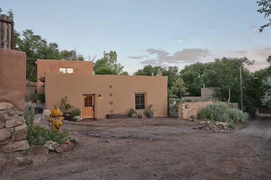 Impeccable Historic Eastside 2-bedroom, 2-bath adobe residence and casita combine the rich heritage of the past with contemporary design. Originally constructed in 1890 and designated as a “contributing” property by the Historic Districts Review Board (HDRB), this property was expertly reimagined between 2022 and 2025 by designer Stephanie Sandston of Greathouse Workroom, and has undergone a comprehensive historic rehabilitation. The original structure has been meticulously preserved, featuring structurally stabilized foundations and restored walls. All new infrastructure, plumbing and updated electrical service to 220. All renovations and structural work completed by well-respected adobe historic renovation team. Historic windows and doors have been reopened to their original sizes. The aesthetic of the home reflects a curated design, highlighted by exposed steel structural detailing and custom enhancements throughout. The main house includes a sitting room with a wood stove. Kitchen/dining is appointed with all-new appliances and an island with seating. Studio loft/library showcases custom ponderosa bookcases/desks and exposed adobe walls. Primary bedroom with custom-built headboard, a 15 ft x 9 ft custom draped closet with stainless shelving, and bathroom featuring a copper soaking tub. The casita is a versatile space complete with a sitting room, workspace, kitchenette with a Smeg refrigerator, and a full bath featuring a soaking tub. Its sleeping alcove with a queen bed provides a perfect getaway for guests or a peaceful retreat. In addition to its existing space, the HDRB has approved construction of a 545 sq. ft. two-story standalone studio addition with a 112 sq. ft. portal. Outside, the garden area features a beautifully crafted stone yard wall and a custom gate entrance, creating an inviting outdoor oasis for enjoyment and relaxation. Minutes from The Plaza and Canyon Road.