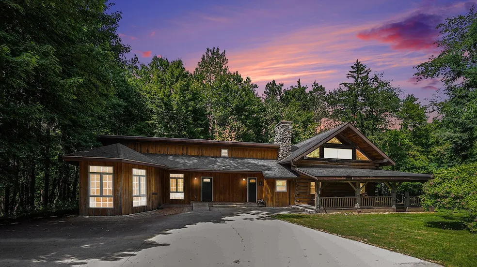 FULL 3D Tours Available ! -This is a modernized Log Home on 8 acres of woods. This home offers 4 bedrooms, 2 1/2 baths a wide wrap around deck and huge patio. With classic vintage log home design, the living room features open ceilings and stone fireplace. and a soap stone stove. An open stairway leads to an open upper loft bedroom/office with private bath. The second half of the home (added in 1992) is the modern part. A side entrance leads to the main bedrooms and private areas custom finished with oak trim and drywall. Enjoy both lifestyles! You simply must see the 3D TOURS to visualize it. Large detached 4 car garage/pole barn -32x60 with12' doors and cantilever carport with an ALL paved driveway. Call to schedule a private tour .