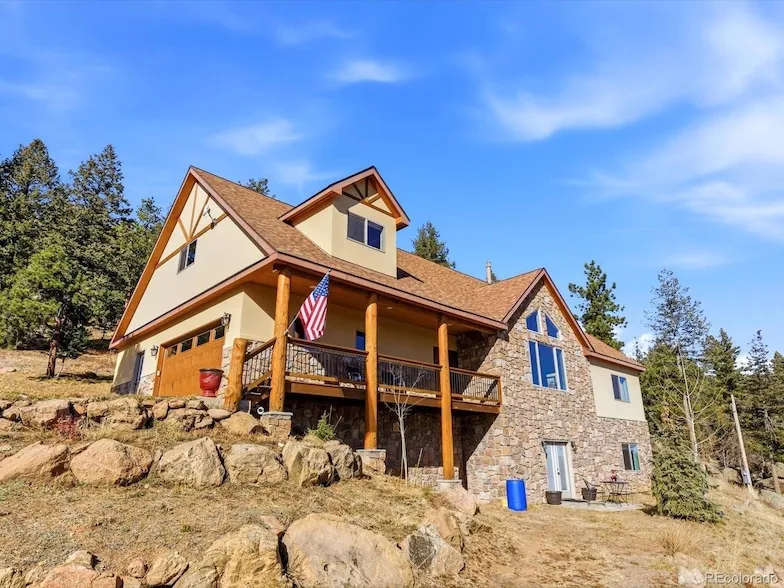 Located in the highly desirable Homestead neighborhood, this custom built mountain home offers the perfect blend of community, privacy, and convenience, all just a short drive to Denver. Built and lovingly maintained by the original owners, the home has been exceptionally well cared for and presents like a brand new home. The highly sought after main floor living floor plan features a spacious primary suite on the main level, along with a second main level bedroom with its own bathroom, ideal for guests or multi-generational living. Vaulted ceilings and a wall of windows fill the main living area with natural light and showcase rolling mountain views, creating a welcoming space for everyday living. The open concept kitchen is both beautiful and functional, featuring striking cabinetry, a gas cooktop, double oven, wine fridge, large island, and abundant countertop space for meal prep and gathering. The layout flows seamlessly into the dining and living areas, making it ideal for entertaining. Upstairs, a massive bonus room offers incredible flexibility and could easily serve as a fifth bedroom, home office, art studio, or game room. The walk out lower level extends the living space with a bar and plenty of room for a pool table, shuffleboard, darts, or movie nights plus two more bedrooms. A generously sized mudroom provides the perfect drop zone for Colorado living, with space for boots, coats, laundry, dogs with muddy paws, and even an extra refrigerator. Car enthusiasts and outdoor adventurers will appreciate the attached two car garage plus a detached two car garage, ideal for a workshop or storing skis, bikes, and fly fishing gear. Situated on a quiet cul-de-sac with a private backyard, this home offers a peaceful mountain setting with a true neighborhood feel. Start your day with a cup of coffee on the front porch as the morning sun rolls in and indulge in the best of mountain living!